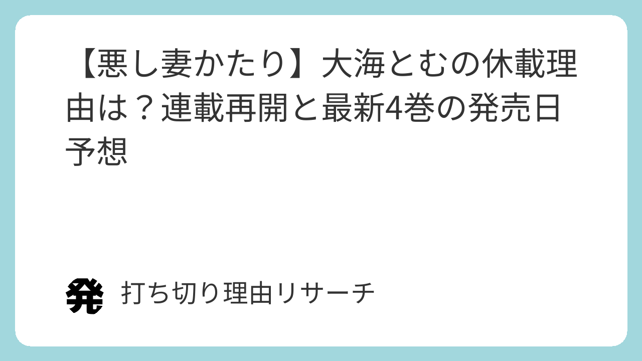結論から申し上げますと、『悪し妻かたり』の休載理由は、作者である大海とむ先生の体調不良によるものです。