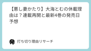 和風ファンタジーと濃密なロマンスが織りなす大海とむ先生の『悪し妻かたり』。単行本第3巻の発売以降、物語がストップしていることに不安を感じているファンも多いのではないでしょうか。結論から申し上げますと、『悪し妻かたり』の休載理由は、作者である...